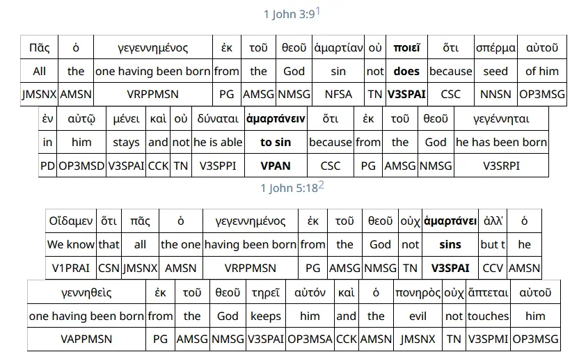 I have bolded the words above on which I would like to focus. In 1 John 3:9, the Greek word ποιεῖ (poiei) means to do, to practice. The V3SPAI is shorthand for Verb, 3rd Person Singular, Present, Active, Indicative. Likewise, VPAN means, Verb, Present, Active, Indicative.