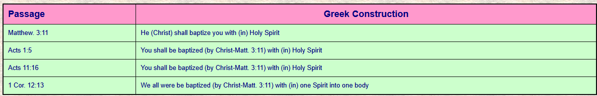 But someone might raise an objection and say, “The Spirit baptism mentioned in Matthew 3:11 and Acts 1:5 is different from the Spirit baptism mentioned in 1 Corinthians 12:13. In Matthew 3:11 and Acts 1:5 Christ is the Baptizer, but in 1 Corinthians 12:13 the Holy Spirit is the Baptizer. As we read the English Bible this seems to be the case, but the Greek construction of Matthew 3:11 and Acts 1:5 is practically identical to that of 1 Corinthians 12:13, as the following chart illustrates.