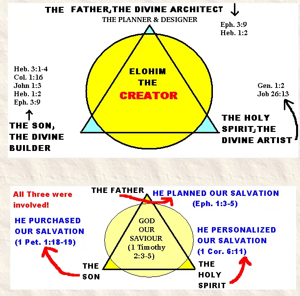 The following two graphics illustrate the work of the Triune God in creation and in redemption: