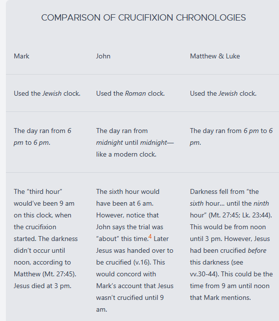 Problem: John records that Jesus was still on trial at the “sixth hour” (Jn. 19:14). Likewise, Matthew records that the darkness fell from “the sixth hour… until the ninth hour” (Mt. 27:45; Lk. 23:44). However, Mark records, “It was the third hour when they crucified Him” (Mk. 15:25). Mark writes that Jesus was crucified at 9am or “the third hour” (Mk. 15:25), while John records that he was crucified at noon or “the sixth hour” (Jn. 19:14). Mark agrees that the darkness occurred from noon until 3pm (Mk. 15:33; cf. Lk. 23:44), yet they disagree on the beginning of Jesus crucifixion. How could John record that Jesus was on trial at the sixth hour, when Mark states that he was already being crucified? How can we resolve this?