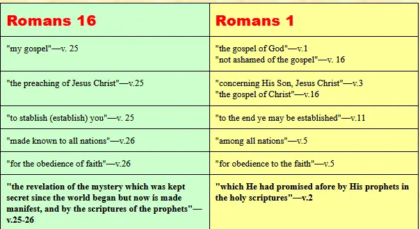 The last of these (in bold print) is actually a contrast. In chapter 1 Paul speaks about the gospel of God which had been promised before by the Old Testament prophets, but in chapter 16 Paul, in speaking of the gospel, mentions a mystery which had been kept secret but which is now revealed by the New Testament prophets. There is a sense in which the gospel is both old and new. There is an aspect of the gospel which is old and which was revealed on the pages of the Old Testament Scriptures. There is another aspect of the gospel which is new and which was kept secret throughout the Old Testament period, but which has been made known during this present age by Paul and other New Testament prophets and apostles.